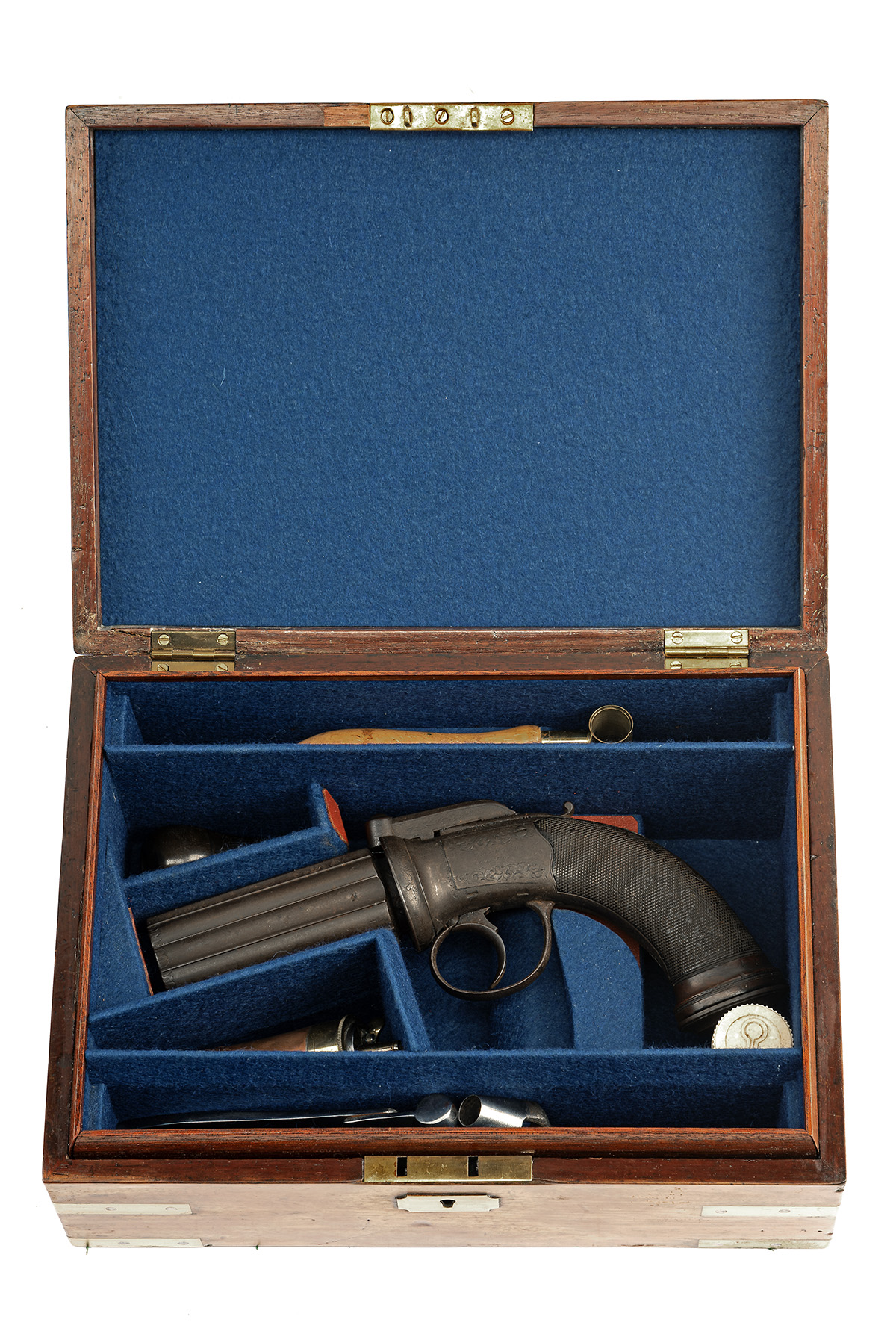 A 50-BORE PERCUSSION PEPPERBOX REVOLVER SIGNED W. RICHARDS, LONDON, no visible serial number, in a later case,