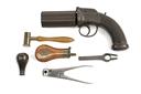 the revolver circa 1840, with fully fluted six-shot 3 1/2in. barrel cluster, the flutes carved in imitation of side-ribs, each chamber numbered '1' through '6' respectively and with Birmingham proofs, moulded and rounded iron border and scroll engraved receiver with central bar hammer, the left side of action signed 'W. RICHARDS, LONDON', the right 'IMPROVED REVOLVING PISTOL', finely chequered walnut grip swelling at the iron mounted pommel with central engraved trap (containing spare nipples) and with guarded trigger, the iron surfaces darkly stained, complete with a brass bound walnut case adapted for this pistol with a compartmented and blue baize lined interior and a number of added accessories