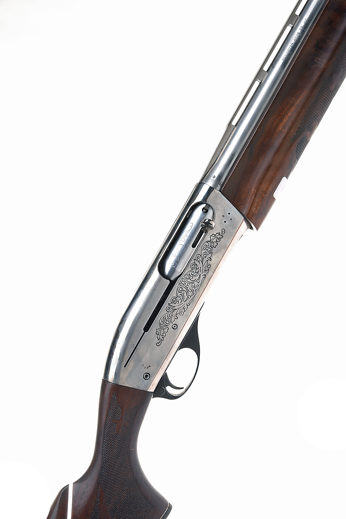REMINGTON 12-BORE 'MODEL 1100' SEMI-AUTO SHOTGUN, serial no. M803996V, for 1978, restricted magazine, 30in. nitro reproved barrel (in 2024), with 7mm raised ventilated matt rib, 2 3/4in. chamber, multichoke (no spares), manual push-button safety, acanthus scroll engraving, brushed bright finish overall, 15in. ornately chequered pistolgrip stock with pistolgrip cap, adjustable comb, including extension and ventilated rubber recoil pad