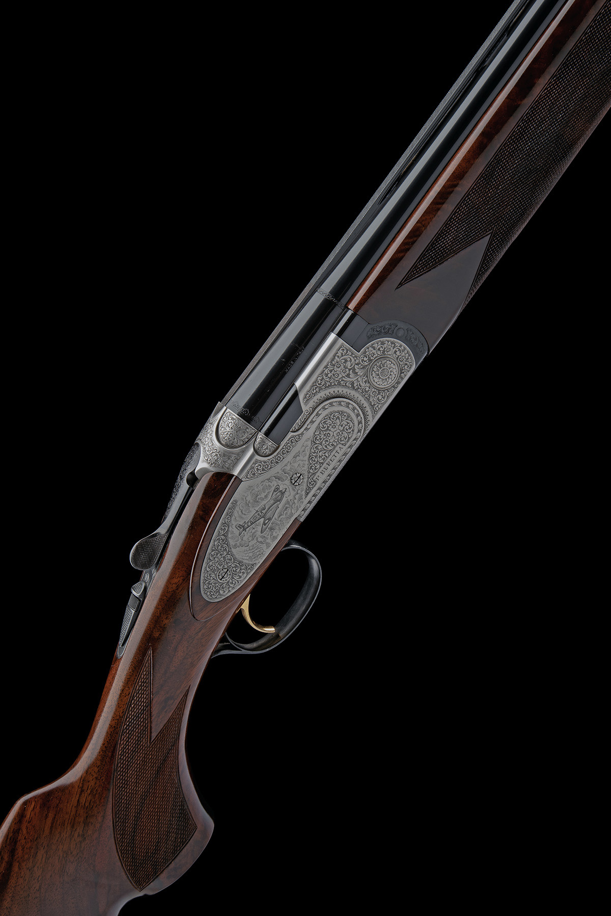 for 1991, 28in. nitro reproved barrels with 5mm ventilated matt top-rib, 2 3/4in. chambers, Teague multichokes (with spares), hold-open toplever, automatic safety with integral barrel selector switch, gold-washed single trigger, action engraved with bold floral and acanthus scrollwork, surrounding aerial scenes of Spitfires and a Messerschmitt Bf110, the underside engraved 'BATTLE OF BRITAIN. 1940 - 1990. 50TH ANNIVERSARY', the triggerplate signed 'Bottega C. Giovanelli' and '24/50', old silver finish, 15in. well-figured pistolgrip stock including 7/8in. recoil pad, weight 7lb. 7oz.