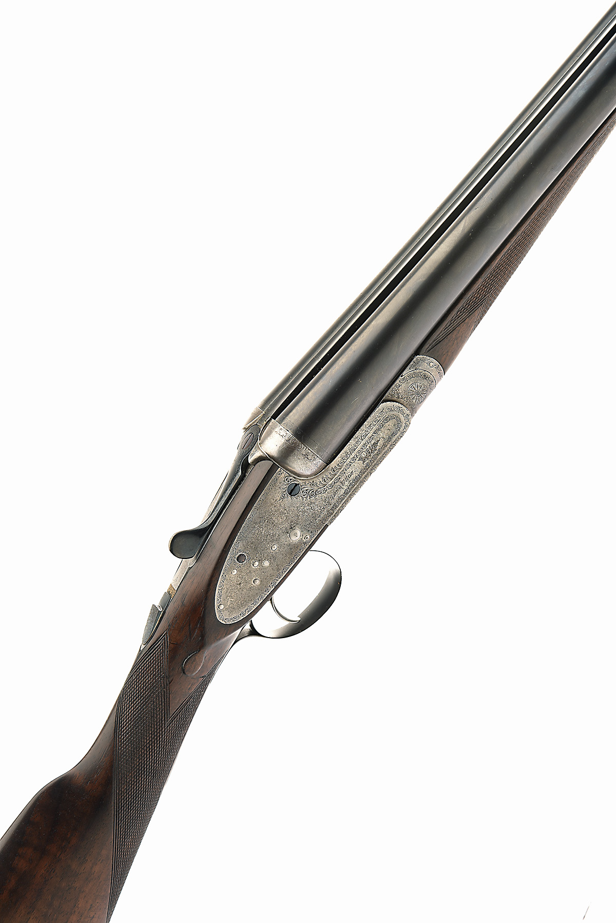 for 1907, 28in. replacement nitro barrels, the tubes engraved 'JOSEPH LANG & SON. 7, BURY STREET, ST. JAMES'S. LONDON. ENGLAND.', 2 1/2in. chambers, bored approx. imp. cyl. and 1/2 choke, treble-grip action with carved fences, automatic safety with brass 'SAFE' plaque, border engraving (some patination overall), bright and reblued finish, 15 1/4in. stock including 1 1/4in. wooden extension, weight 6lb. 7oz., in a universal case