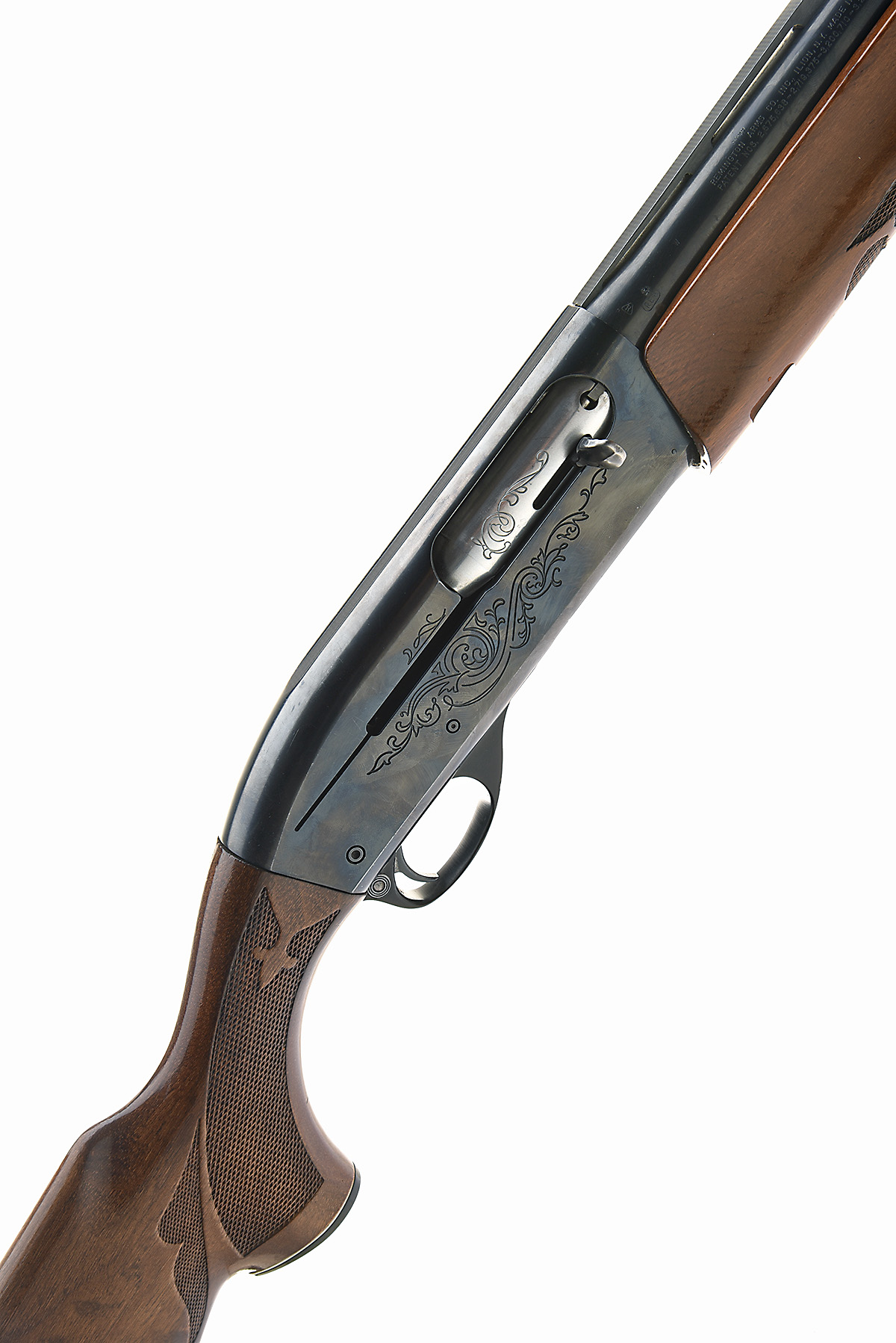 REMINGTON 12-BORE 'MODEL 1100' SEMI-AUTO SHOTGUN, serial no. M089803V, for 1975, restricted magazine, 25 1/2in. nitro reproved barrel (in 2024), with 8mm ventilated matt rib, 2 3/4in. chamber, bored approx. 1/4 choke, manual push-button safety, blacked action with acanthus scroll engraving, 14in. ornately chequered pistolgrip stock including rubber recoil pad