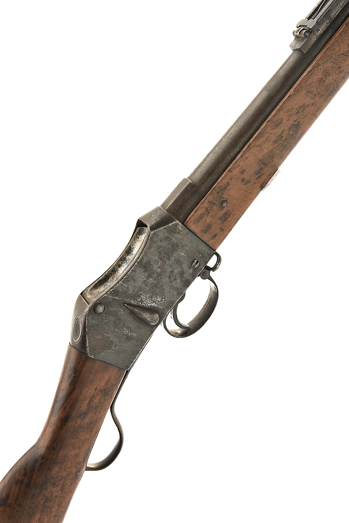 * A BELGIAN .577/450 MARTINI-HENRY MARK II TYPE RIFLE, UNSIGNED, serial no. WR114009, circa 1880s, with 32 1/2 in. sighted barrel with Liege proof-mark by receiver, Smuts number WR114009 stamped to right side of receiver and electro-stencilled over, large cocking indicator, short lever, wooden stock, barrel bands, sling swivels and butt-plate, worn, furniture painted black, stock sanded, clearing rod absent, 49 1/2 in. overall length