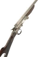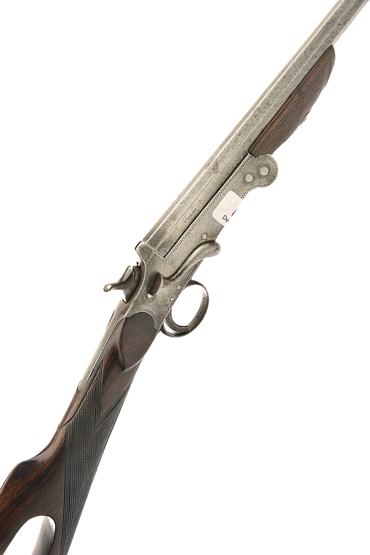 A SKELETAL STOCKED BELGIAN .410 SINGLE-BARRELLED SIDELEVER FOLDING HAMMERGUN, serial no. 517, circa 1900, 27 1/2in. (70cm) black powder only octagonal to round barrel (pitted), 2 1/2in. chamber, bored approx. true cyl., border engraving, brushed bright finish overall, 14 1/4in. skeletal stock including steel buttplate
