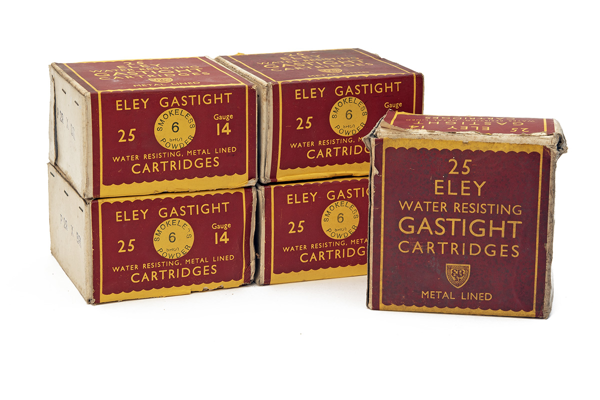 THREE SEALED BOXES OF (25) ELEY GASTIGHT 14 GAUGE WATER RESISTING METAL LINED CARTRIDGES, with two opened part boxes, Smokeless Powder 6 Shot