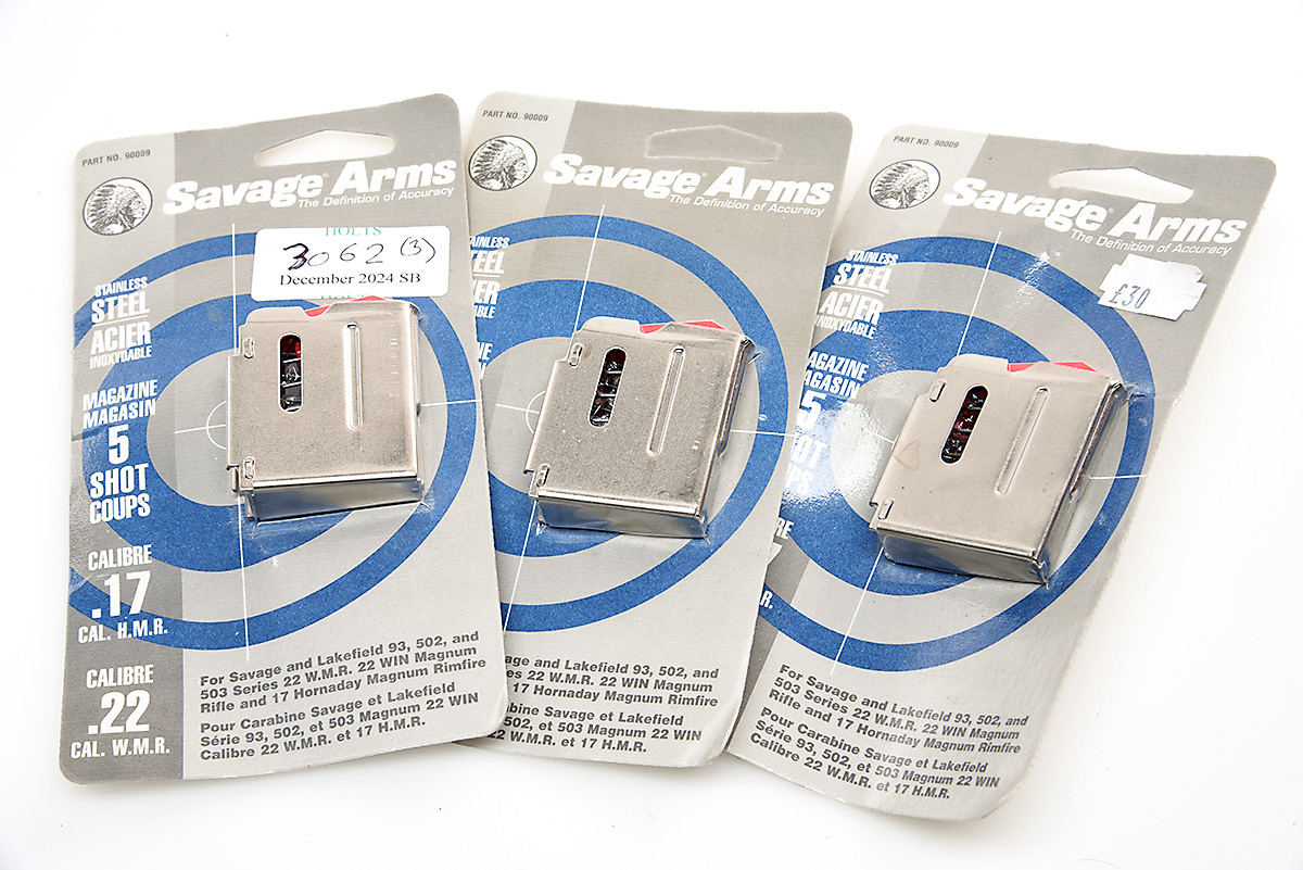 THREE UNUSED 'SAVAGE ARMS' .17H.M.R/.22W.M.R MAGAZINES IN ORIGINAL PACKAGING, 5 round capacity, Savage and Lakefield 93, 305, 310 502 and 503 series .22wmr, .22win magnum rifle and .17 Hornady Magnum Rimfire.