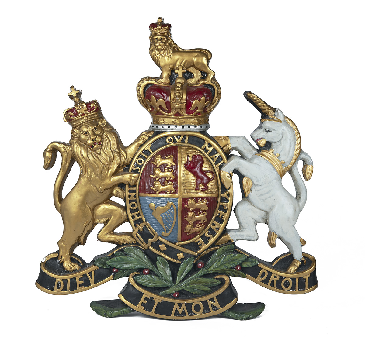 A WALL-MOUNTED COPY OF THE UNITED KINGDOM ROYAL COAT OF ARMS,