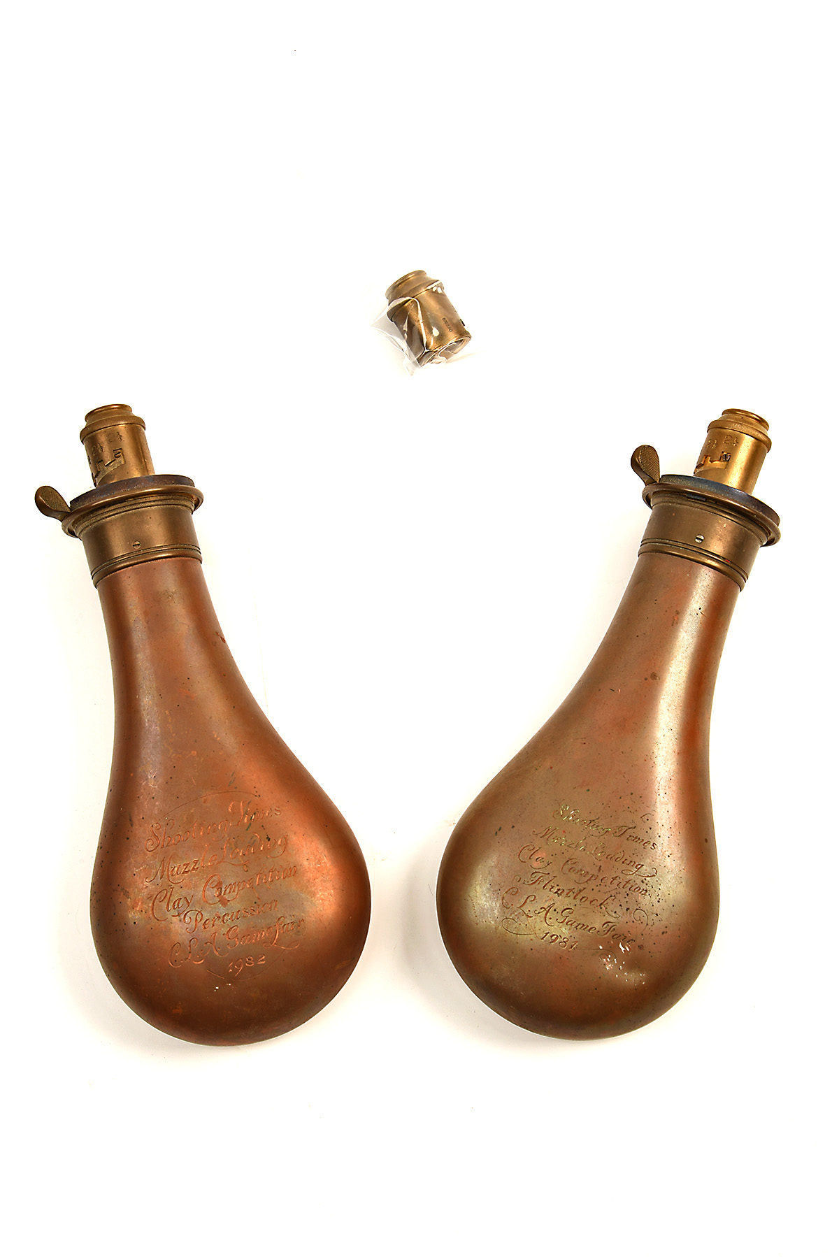 S0725A PAIR OF CLA GAME FAIR COMMEMORATIVE ENGRAVED SPORTING POWDER FLASKS BY THE RENOWNED MAKER M. MARSH, copper and brass, each engraved to one side with 'Shooting Times / Muzzle Loading / Clay Competition / Flintlock / C.L.A. Game Fair', followed by the date '1981' and '1982', fully working with graduated spouts, caps stamped 'M.MARSH / SHEFFIELD', a little shallow denting, comes with a spare/replacement spout