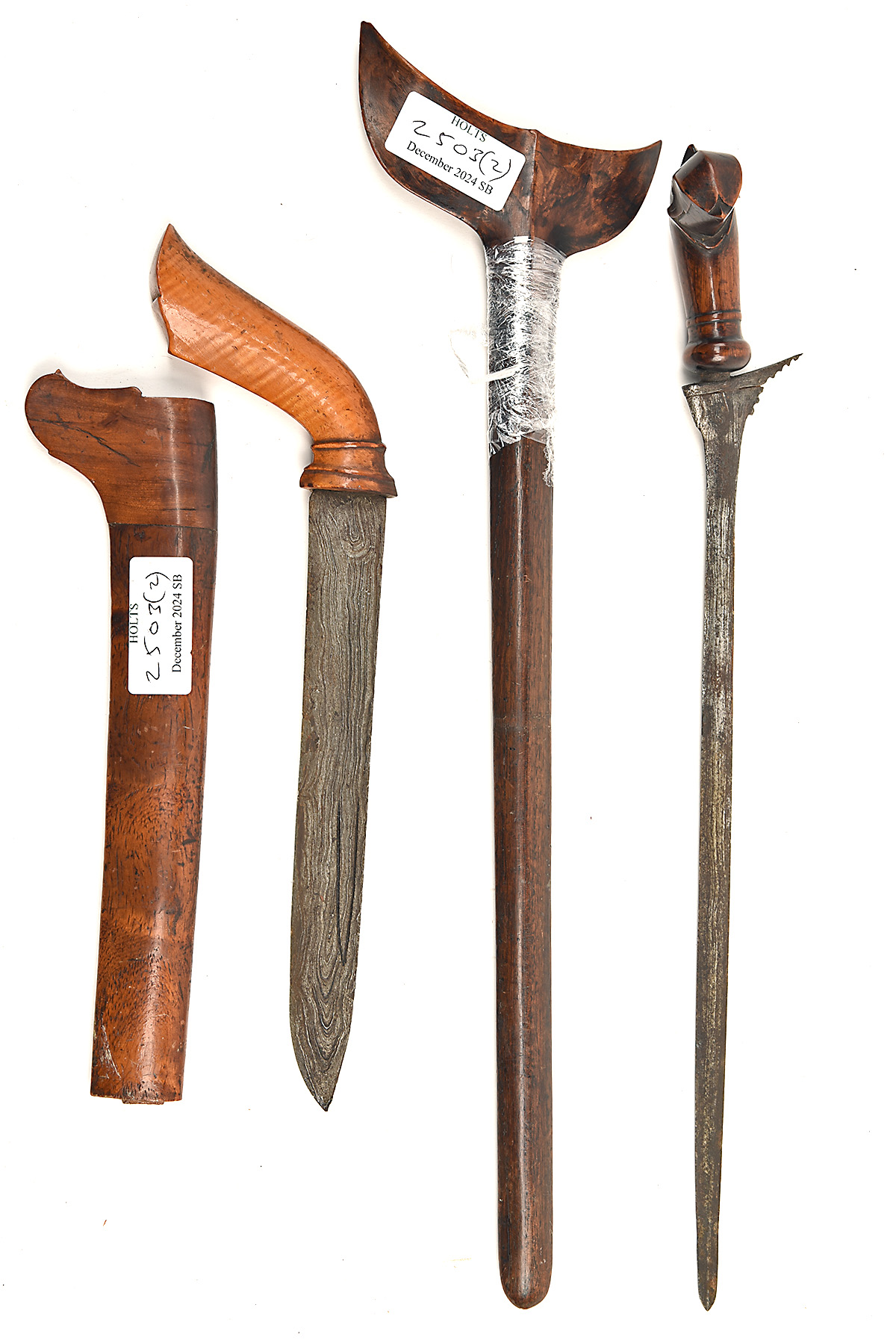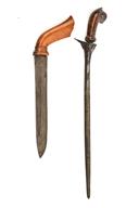 A PAIR OF MALAY EDGED WEAPONS, BEING A BADE-BADE AND A KRIS, circa late 19th-early 20th Century, 1) Bade-Bade with 8 in. single-edged watered Malay steel blade set in a carved wooden handle and held in its carved wooden scabbard, some closed and tight cracking in the scabbard, with scabbard tip missing, 11 1/2 in. overall; 2) Kris with 13 in. straight double-edged Malay steel blade of typical 'sleeping snake' form, carved wooden bird's-head handle, together with its wooden scabbard, blade pitted, scabbard throat cracked and glued, 19 in. overall (2)