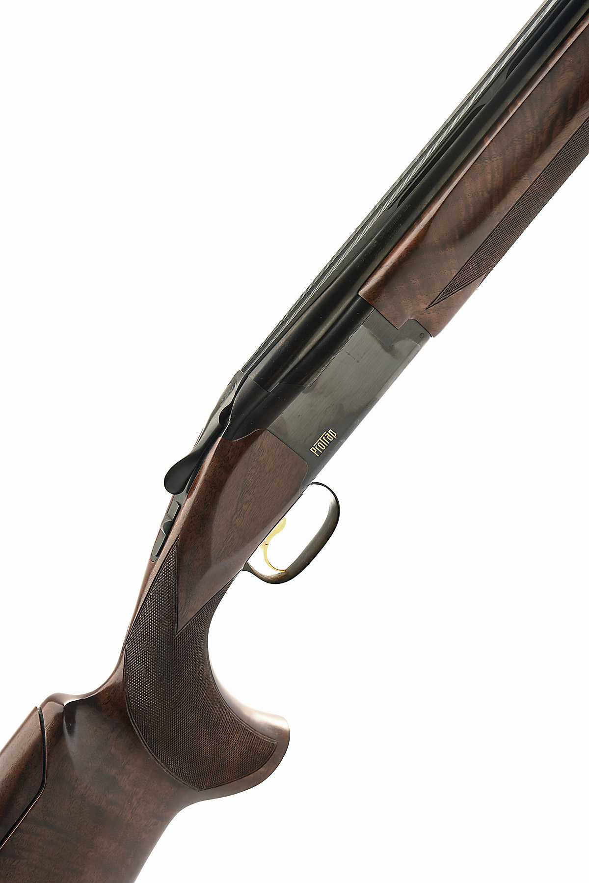 BROWNING S.A. 12-BORE 'B725 PROTRAP' SINGLE-TRIGGER OVER AND UNDER EJECTOR, serial no. 522452T, for 2016, 32in. high-performance steel shot proved nitro barrel with 12mm ventilated matt top-rib, ventilated mid-rib, 3in. chambers, multichoke (with spares), hold-open toplever, manual safety with integral barrel-selector switch, adjustable gold-washed single-trigger, blacked action with gold-inlaid model designation, 15in. pistolgrip stock including rubber recoil pad, with adjustable comb and palm swell, semi-beavertail fore-end, weight 9lb. 1oz., in its makers universal