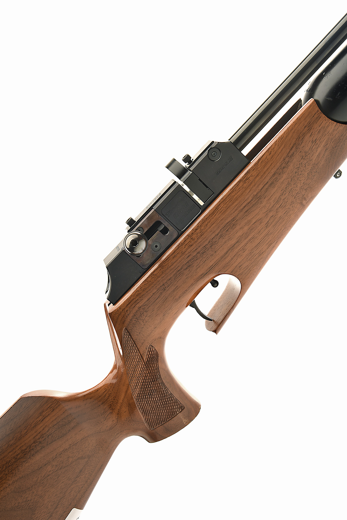 AN FAC-RATED .22 THEOBEN RAPID MKII PRE-CHARGED PNEUMATIC AIR-RIFLE, serial no. 012881, with blued 25 3/4in. barrel including detachable sound moderator, blued bolt-action receiver with detachable 12-shot magazine, right-hand walnut half-stock and large capacity under-barrel air-reservoir, untested plus moderator