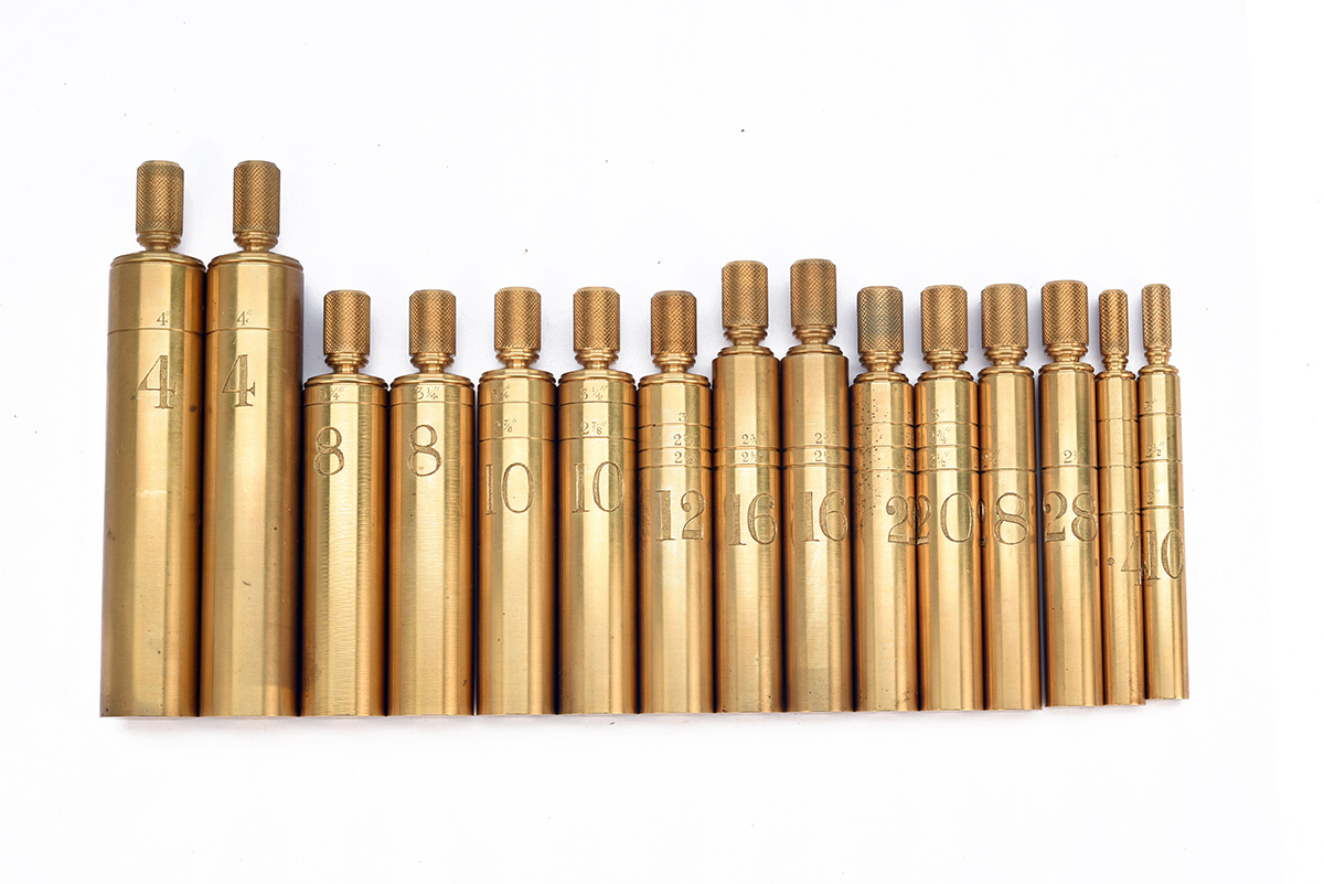 FIFTEEN ENGRAVED BRASS BORE CHAMBER GAUGES, comprising of .410, 28, 20, 16, 12, 10, 8, 4 bore (15)