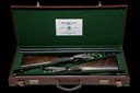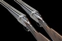 for 1983, 27 1/2in. nitro reproved chopperlump barrels (in 2025), the ribs engraved in gothic script 'The Sackville' and gold-inlaid '1' and '2', the tubes engraved in further gothic script 'Made by Pedro Arrizabalaga Eibar For John Rigby & Co. London', 2 3/4in. chambers, bored approx. imp. cyl. and 1/2 choke, toplevers gold-inlaid '1' and '2', automatic safeties with gold-inlaid 'SAFE' details, carved leaf fences, removable striker discs, Holland & Holland style self-opening systems, dipped-edge lockplates with gold-inlaid cocking-indicators, articulated front triggers, rolled-edge triggerguards, bold acanthus scroll engraving, the lockplates with 'Made for John Rigby', the undersides with 'PEDRO ARRIZABALAGA EIBAR' in roundels, toplever not returning to centre position on closing No.2, bright and blued finish, 14 5/8in. figured stocks, small chip to fore-end wood No.1, weight 6lb. 13oz., in their brass-cornered leather case