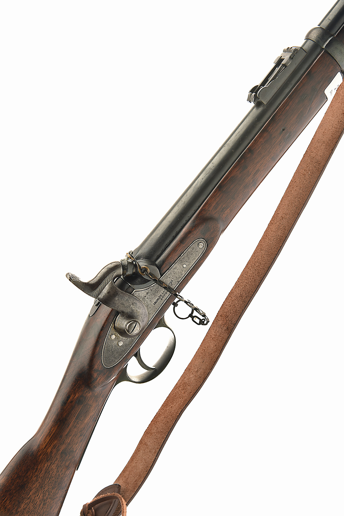 A .577 PERCUSSION CHARLES LANCASTER OVAL BORE MUSKET. no visible serial number, with reblued 31 3/4in. sighted barrel marked 'LANCASTER'S PATENT', signed military-style lock, walnut full-stock with iron furniture, the heel-plate spur stamped 'VF' over '/I\' over '80', chained nipple protector, two barrel-bands and jag-ended ramrod, fitted with a later leather sling