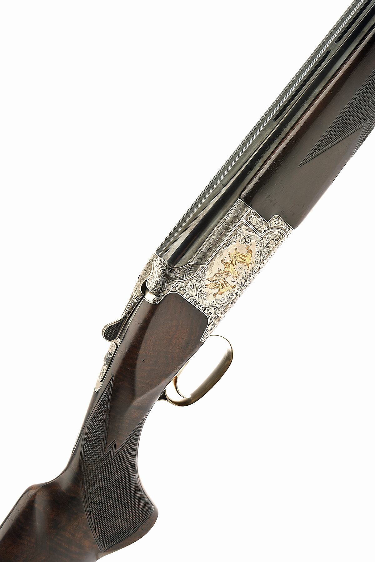BROWNING 12-BORE '325 GRADE VI' SINGLE-TRIGGER OVER AND UNDER EJECTOR, serial no. 52460PN, dated 1989, 30in. nitro barrels with 13mm ventilated matt top-rib, 2 3/4in. chambers, multichokes (no spares), hold-open toplever, manual safety with integral barrel selector switch, adjustable single trigger, acanthus scroll engraving surrounding gold-highlighted scenes of a brace of flushed pheasant on the left, a trio of mallard in formation on the right, the underside with a hound on point, 13 3/4in. figured pistolgrip stock including 1/4in. extension, weight 7lb. 7oz., in a universal case