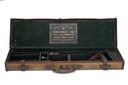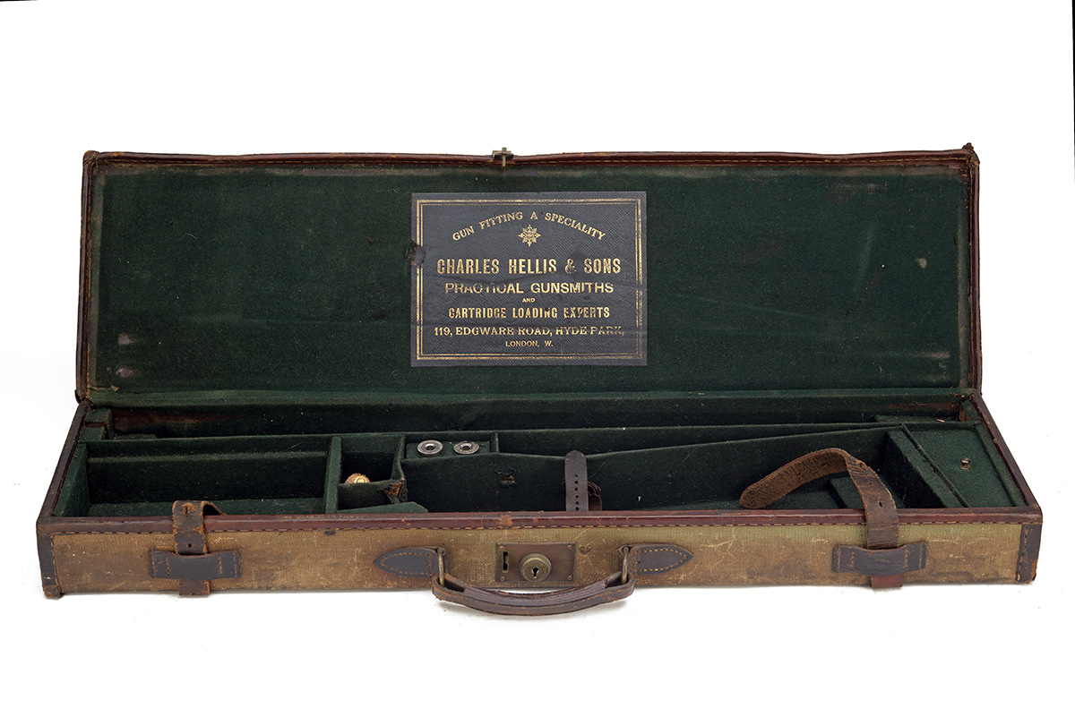 A CANVAS AND LEATHER SINGLE GUNCASE, fitted for 30in. barrels, the interior lined with green baize, a leather Charles Hellis & sons trade label, two-piece cleaning rod, pair of 12-bore snap-caps, brass lock (key missing)