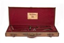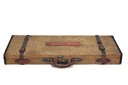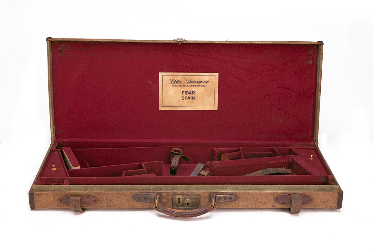 A VICTOR SARASQUETA CANVAS AND LEATHER DOUBLE GUNCASE, fitted for fitted fir 27in. barrels (could adapt to 30in.), the interior lined with read baize, a Victor Sarasqueta trade label, brass lock (key missing)