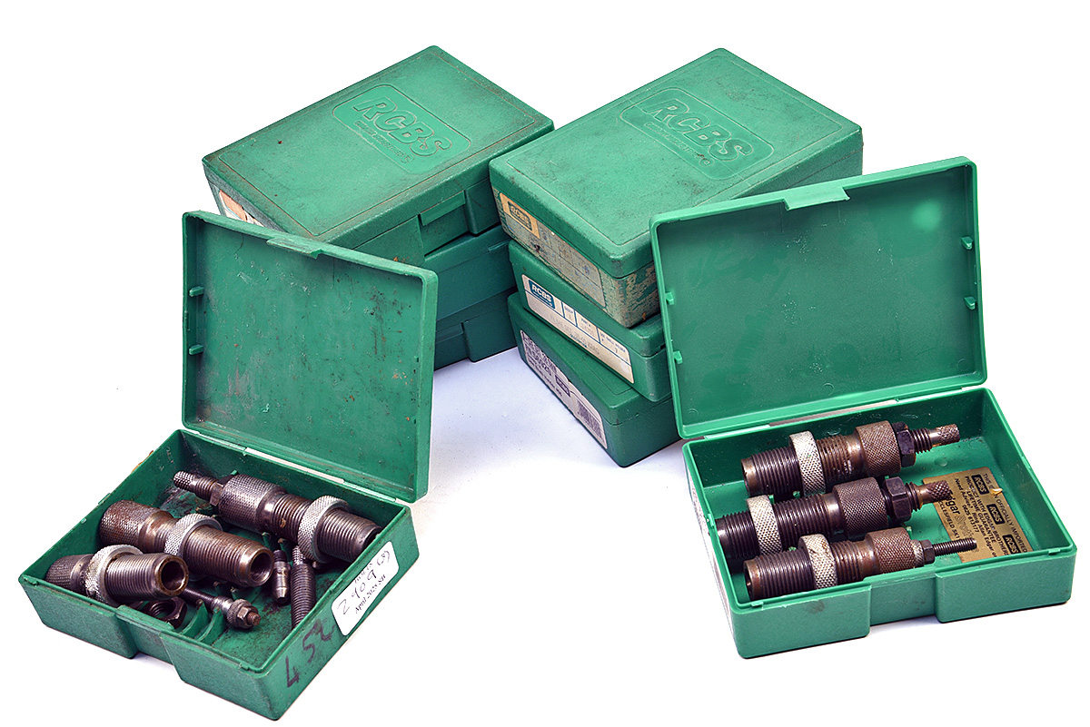 EIGHT VARIOUS 'RCBS' RELOADING DIE SETS IN CASES, comprising of 3 piece .455, 3 piece 577/450 M-H, 2 piece 11X59R gras, 3 piece 450 EX, 6.5mm x 54 MS No. 27701, 3 piece .38 S&W No. 56920, FL .30-40 KRAG No. 14701, possible 3 piece 303 (8)