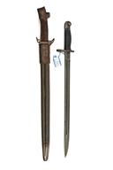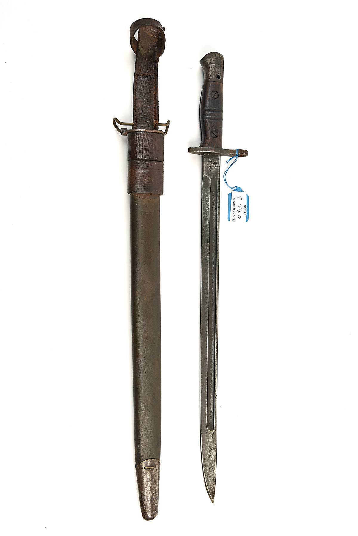 A BETTER UNITED STATES WORLD WAR I PATTERN 1913 SWORD BAYONET BY REMINGTON, dated 1917, with 17 in. single-edged steel blade fullered on each side, ricasso marked '1917' and Remington marker-mark to one side with eagle head, flaming grenade, '18 / US and 'X' over, wooden grips, pommel with oil hole, together with its black leather scabbard marked 'JEWELL 1918' with integral brown leather frog, some pitting to exposed steel, release button frozen, 23 in. overall