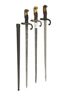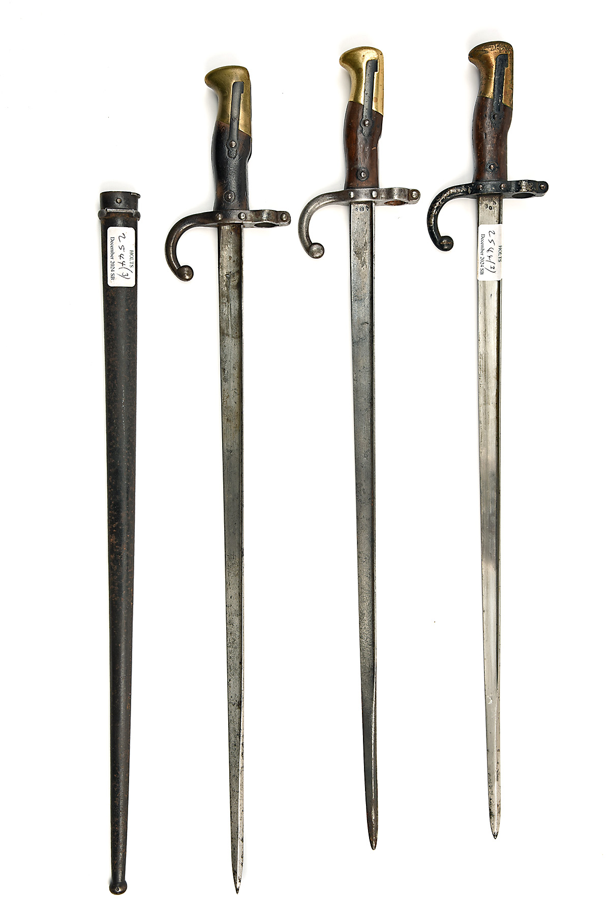 A GROUP OF THREE FRENCH MODEL 1874 SWORD BAYONETS FOR THE GRAS RIFLE, dated 1878-80, with 20 1/2 in. single-edged blades, quillioned cross-guards, wooden grips and brass pommels, 1) blade back engraved for Tulle arsenal and dated 1878, forte and quillion with inspection marks, cross-guard numbered '96757' matched to scabbard, worn, blade stained with some blinded pitting, cross-guard and quillion with blinded pitting, release catch rusted and frozen, scabbard rusted and pitted; 2) blade back engraved for Chatellerault arsenal and dated 1879, forte with inspection marks, worn, quillion and cross-guard pained black and obscuring markings, pommel painted gold, no scabbard; 3) blade back engraved for Chatellerault arsenal and dated 1880, forte and quillion with inspection marks, numbered 48482, worn, blade with some pitting, cross-guard and quillion with heavy blinded pitting and rubbed markings, no scabbard (3)