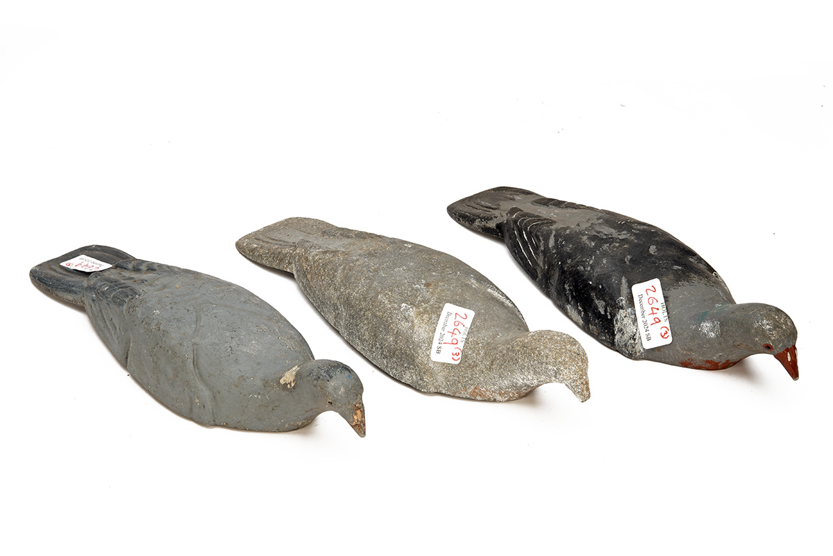 THREE ANTIQUE ALUMINIUM PIGEON DECOYS, two 'JOHN PESKETT' patent No. 14173 decoys, one unbranded (3)