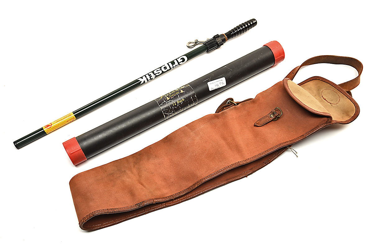 A BRADY CANVAS & LEATHER GUNSLIP WITH LINDEN GRIPSTICK & PARADOX 12-BORE CLEANING KIT (3)