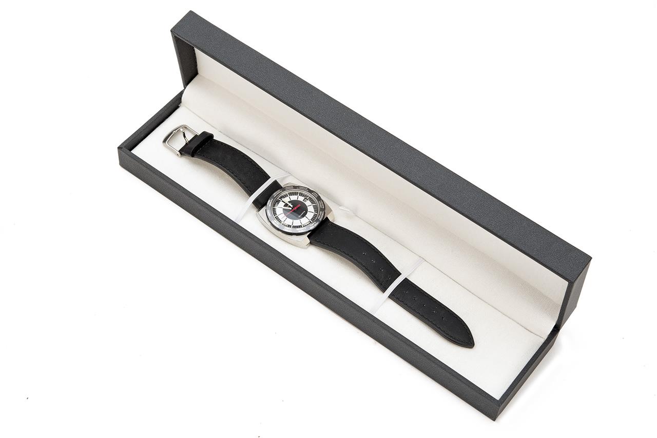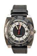 A BOXED TIMEX 'WORLD TIME 1972 REISSUE' WRISTWATCH, a tribute to Timex Model 41 from the 1970's, 39mm barrel shaped stainless steel case, 12mm height, high contrast black and white dial with oversized bi-directional rotating bezel marking Greenwich Mean Time and 23 cities from different time zones with French spelling, geometric red second hand, domed acrylic crystal, date window at 3 o'clock, in its original box with paperwork and swing tag
