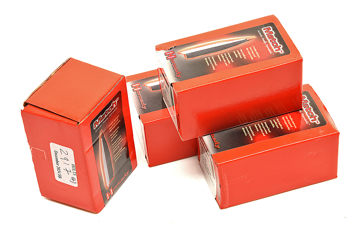 FOUR UNUSED HORNADY MATCH .338 CALIBRE BULLET HEADS IN BOXES, (4)
