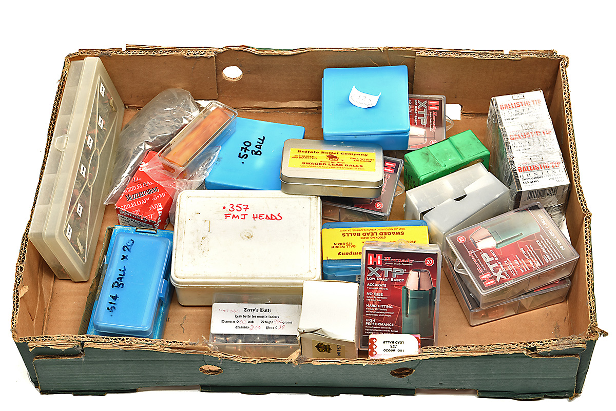 A QUANTITY OF BULLET HEADS, LEAD BALLS AND RELATED ITEMS, includes approx. 100 'HORNADY XTP' 50 cal 240grin in box, approx. 300 .357 FMJ bullet heads in tub, approx. 200 'BUFFALO BULLET' .50 cal .490 dia 179 grain lead ball in box, approx. 100 .541 cal lead balls in box, approx. 12 .514 lead ball in box, approx. 30 .570 lead ball in box, approx. 90 'HORNADY' 40 cal No6025 lead ball in box, approx. 400 lead and copper shot of various sizes, 'LEE' beeswax, approx. 200 felt wads, approx 200 'HENRY KRANK' card wads among other related items