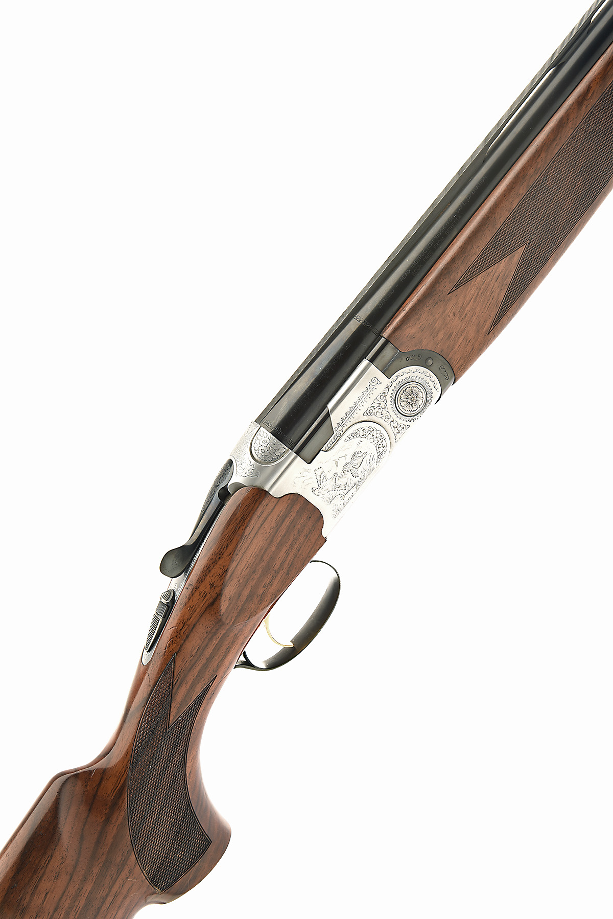 for 2002, 28in. nitro barrels with 6mm ventilated matt top-rib, 3in. chambers, bored approx. imp. cyl. and 1/2 choke, hold-open toplever, automatic safety with integral barrel selector switch, gold-washed trigger, slightly stiff to open, game and scroll engraving, bright finish, 14 1/2in. pistolgrip stock including 3/8in. recoil pad, weight 7lb., in a universal case