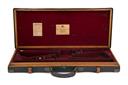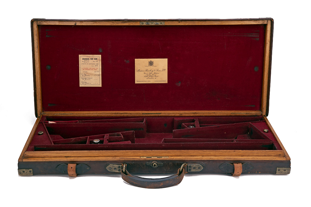 fitted for 29in. barrels, red baize lining with James Purdey 1938-1955 trade label and hand written charges label for gun numbers 21276 and 21457, with a pair of nickel plated snapcaps and a nickel plated oil bottle with 'J. WOODWARD & SONS. LONDON' engraved on the screwcap, brass lock (no key), the lid exterior with central blank circular brass escutcheon and initialled 'J.F.R.'