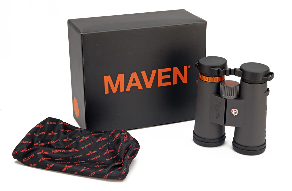 A VIRTUALLY UNUSED PAIR OF MAVEN C SERIES 'C1' COMPACT 10X42 BINOCULARS, numbered 10682, grey / orange colour, 5 3/4in. length and 24 1/2oz. in weight, with lens caps, extra-low dispersion ED glass with multi-coated lenses, phase correction coating, tripod adaptable, with a double-layered microfibre storage bag and neoprene neck strap, all in its original box with paperwork and outer carton