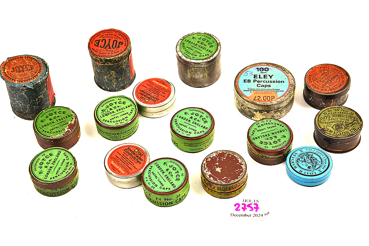 16 VARIOUS TINS OF MOSTLY VINTAGE PERCUSSION CAPS, Please be advised that cartridges/ammunition, primers, primed cases, blanks and percussion caps CANNOT BE SENT ANYWHERE in the UK or EXPORTED OVERSEAS by POST or CARRIER. Due to this NATIONAL and INTERNATIONAL CARRIER rule, within 30 days of the sale date, please arrange collection with our shipping department from our Norfolk HQ. If payment and collection is not arranged within 30 days of the sale date, that will indicate that the items are not required and they will be disposed of.