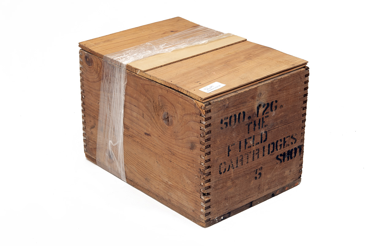 A 'GEORGE GIBBS' OF BRISTOL 500 12-BORE FIELD CARTRIDGES WOODEN TRANSPORT BOX with homemade lid