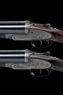 for 1924, 30in. Whitworth-steel nitro chopperlump barrels (No.2 reproved in 2024), the ribs engraved 'J. PURDEY & SONS. AUDLEY HOUSE. SOUTH AUDLEY STREET. LONDON. MADE OF SIR JOSEPH WHITWORTH'S FLUID PRESSED STEEL' and '1' and '2', 2 1/2in. chambers, bored approx. imp. cyl. both (No.1) and 2 3/4in. chambers, bored approx. true cyl. and 1/4 choke (No.2), toplevers engraved '1' and '2', automatic safeties with gold-inlaid 'SAFE' details, removable striker discs, cocking-indicators, best fine acanthus scroll engraving with floral bouquets, retaining slight traces of original colour-hardening, 16 1/2in. figured stocks including 1 7/8in. wooden extension (No.1) and 2in. wooden extension (No.2), No.1 a replacement, minor setting cracks to rear of top tangs, weight 7lb. 2oz. (No.1) and 6lb. 15oz. (No.2), in their brass-cornered oak and leather case