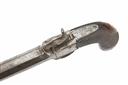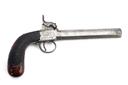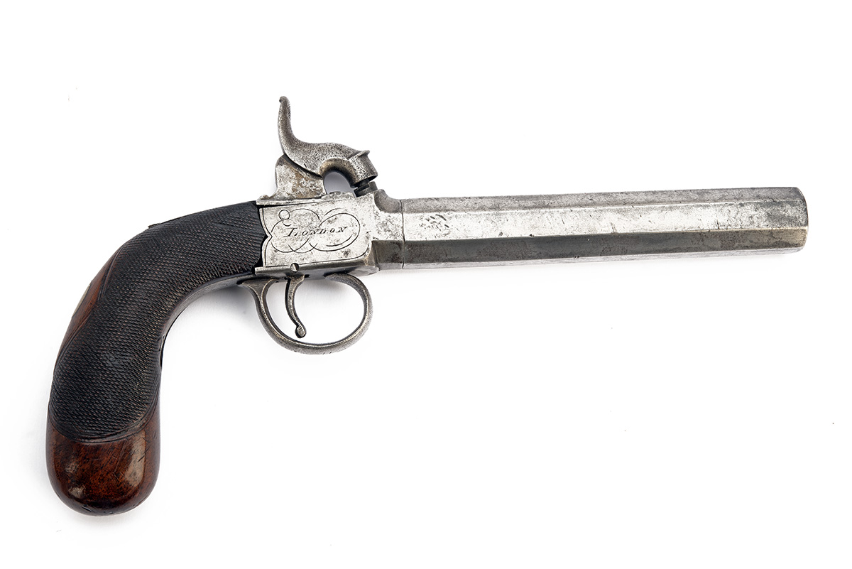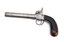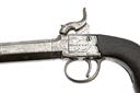 A 32-BORE PERCUSSION BOXLOCK OVERCOAT PISTOL SIGNED MANTON, LONDON, no visible serial number, with turn-off octagonal 5 1/8in. barrel, squared central hammer boxlock action signed 'MANTON, LONDON, guarded trigger and chequered bag-shaped grip