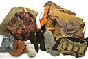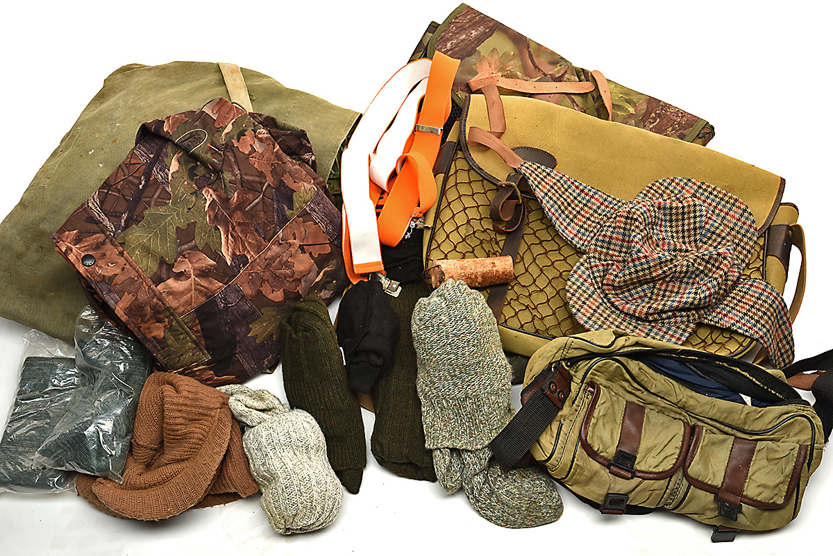 a wooden duck call, 'PRINZ TRAVELLER' bag, military green woolly hat with peak, bronte trousers size 36, 'CHAMPION' jumper size XXXL, 'JERSEY MANS HEAVY OLIVE' size 106cm, 'EASDEN' jumper in green size L, 'HOGGS' trousers size 40, 'STIHL' orange braces, two unused green sock style gunslips, 'HOGGS' herringbone green tweed breeks size 40, 'WHITEWATER OUTDOORS' No. 1221 micro fleece waterproof jacket size XXL in camo, 4 pairs of assorted outdoor socks, 2 pairs of gloves, 3 assorted hats, 'JACK PYKE' waterproof trousers size XXL in camo, 3 assorted game bags, camo netting among other items