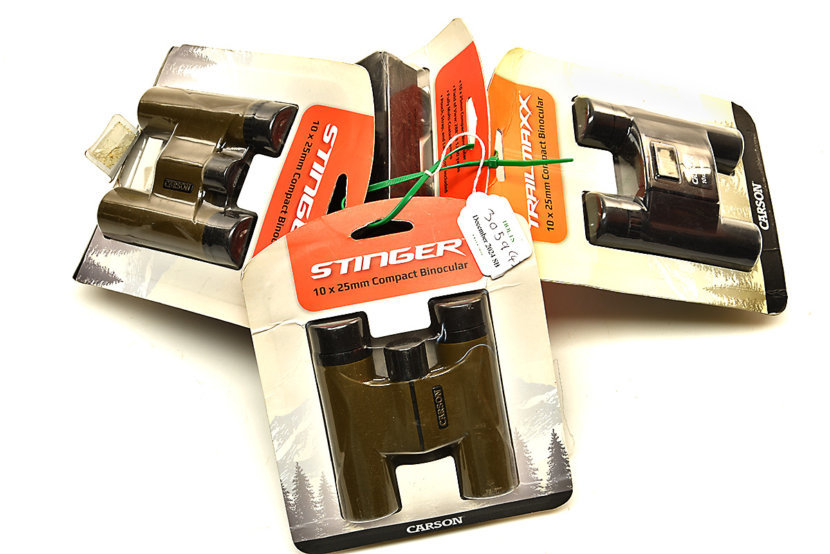 FOUR UNUSED 'CARSON' COMPACT BINOCULARS IN ORIGINAL BOXES, 3 x 'STINGER' 10 x 25mm, 1 x 'TRAILMAXX' 10 x 25mm (4)