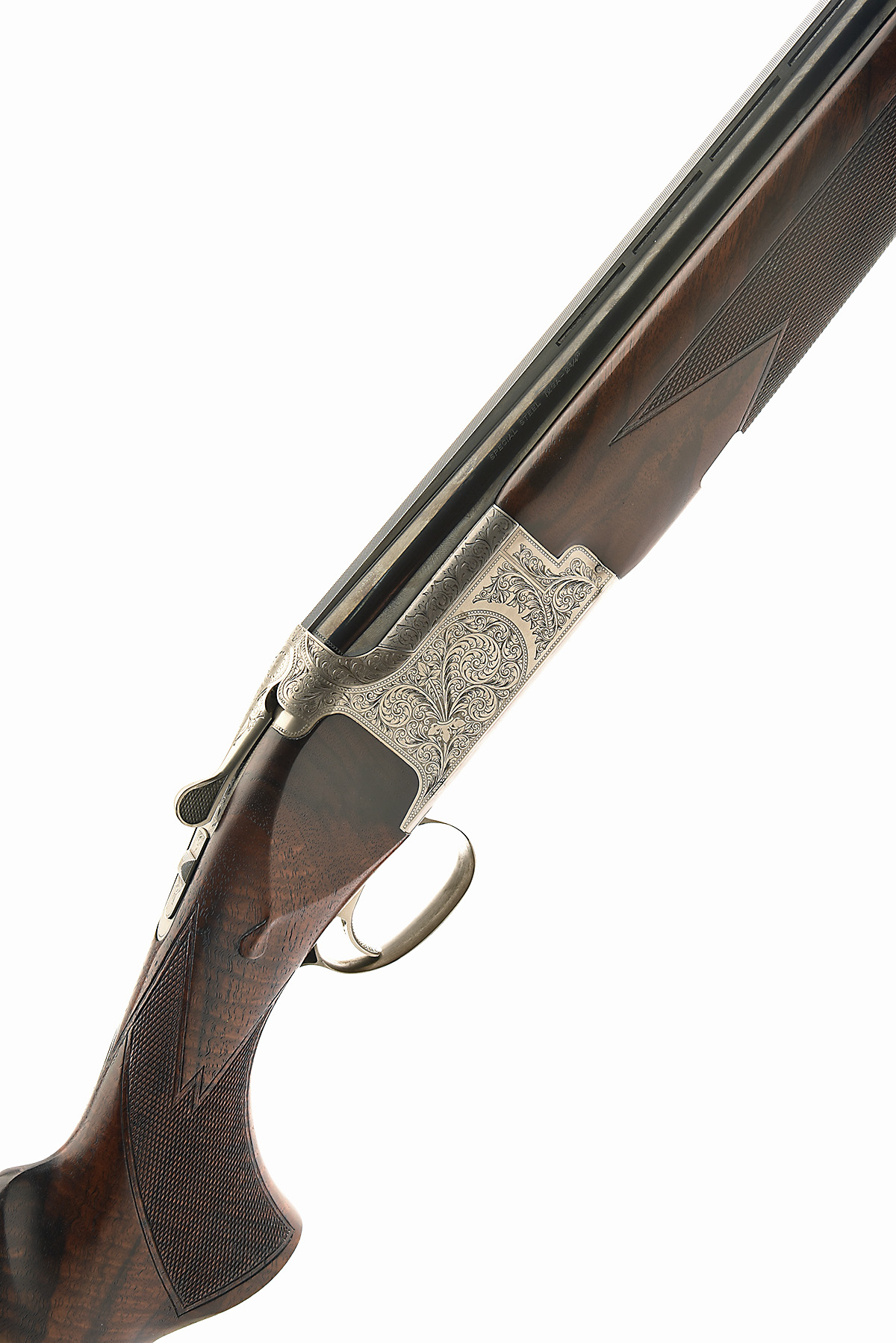 MIROKU FIREARMS MFG. CO. 12-BORE 'MK60 SPORT GRADE V' SINGLE-TRIGGER OVER AND UNDER EJECTOR, serial no. 57546MV, dated 2005, 30in. nitro barrels with 8mm ventilated matt top-rib, 2 3/4in. chambers, bored approx. 1/4 and 3/4 choke, hold-open toplever, manual safety with integral barrel selector switch, beaded border and acanthus scroll engraving, brushed finish, 15in. pistolgrip stock (slight crack at hand) including 3/4in. rubber recoil pad, weight 7lb. 5oz.