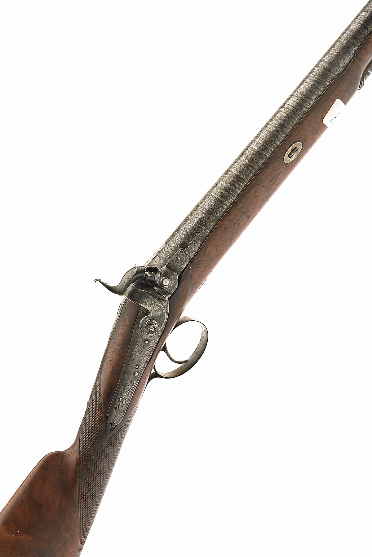 A 12-BORE PERCUSSION SINGLE-BARRELLED SPORTING-GUN SIGNED WILLIAMSON, no visible serial number, with 30in. twist barrel having two platinum lines at breech with engraved foliate decoration, signed back-action lock, walnut half-stock with chequered wrist and fitted with engraved iron furniture, the butt with contemporary extension