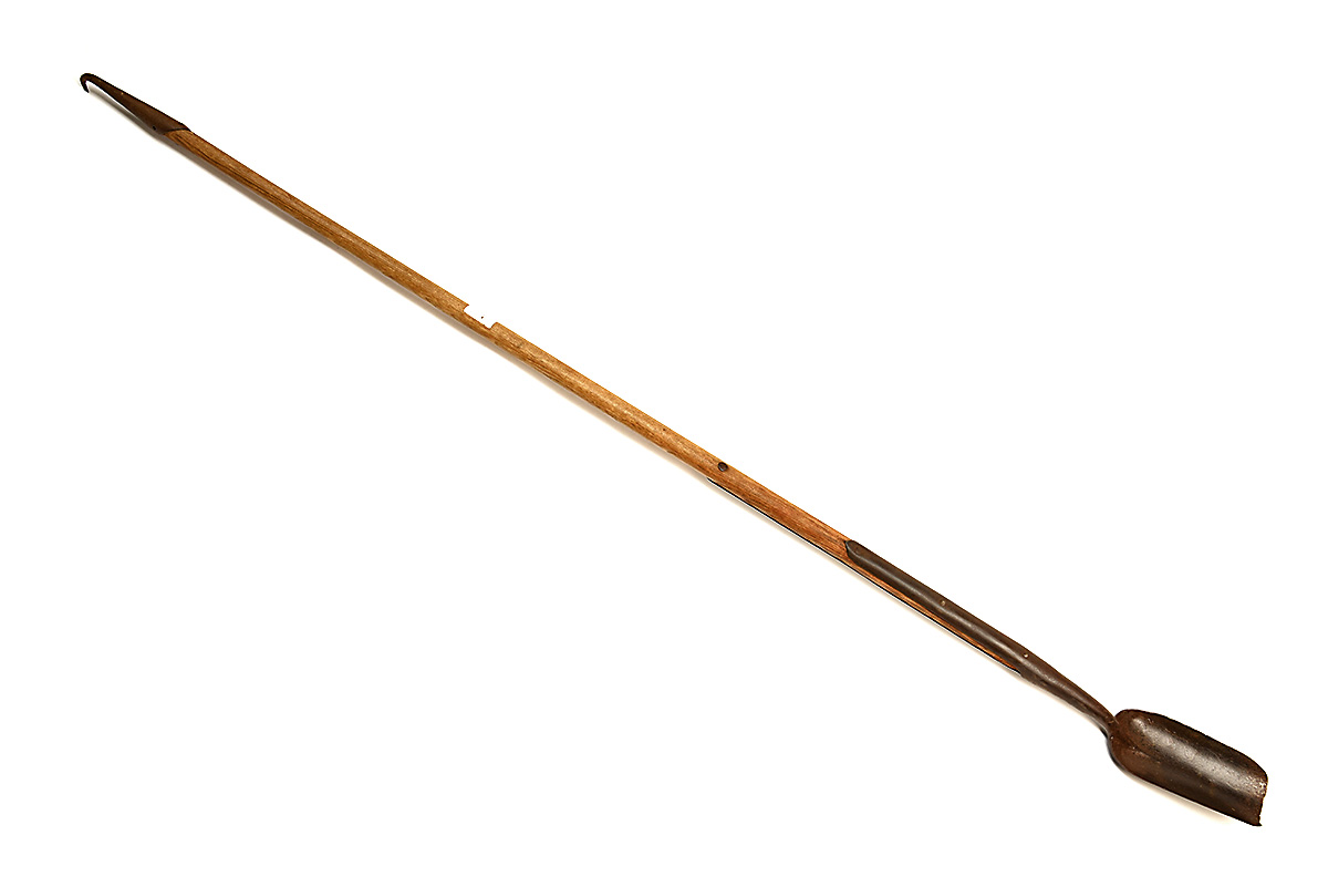 A 'NORFOLK PADDLE' RABBIT SPADE, wood staff with iron spade and hook, approx. 80in. length