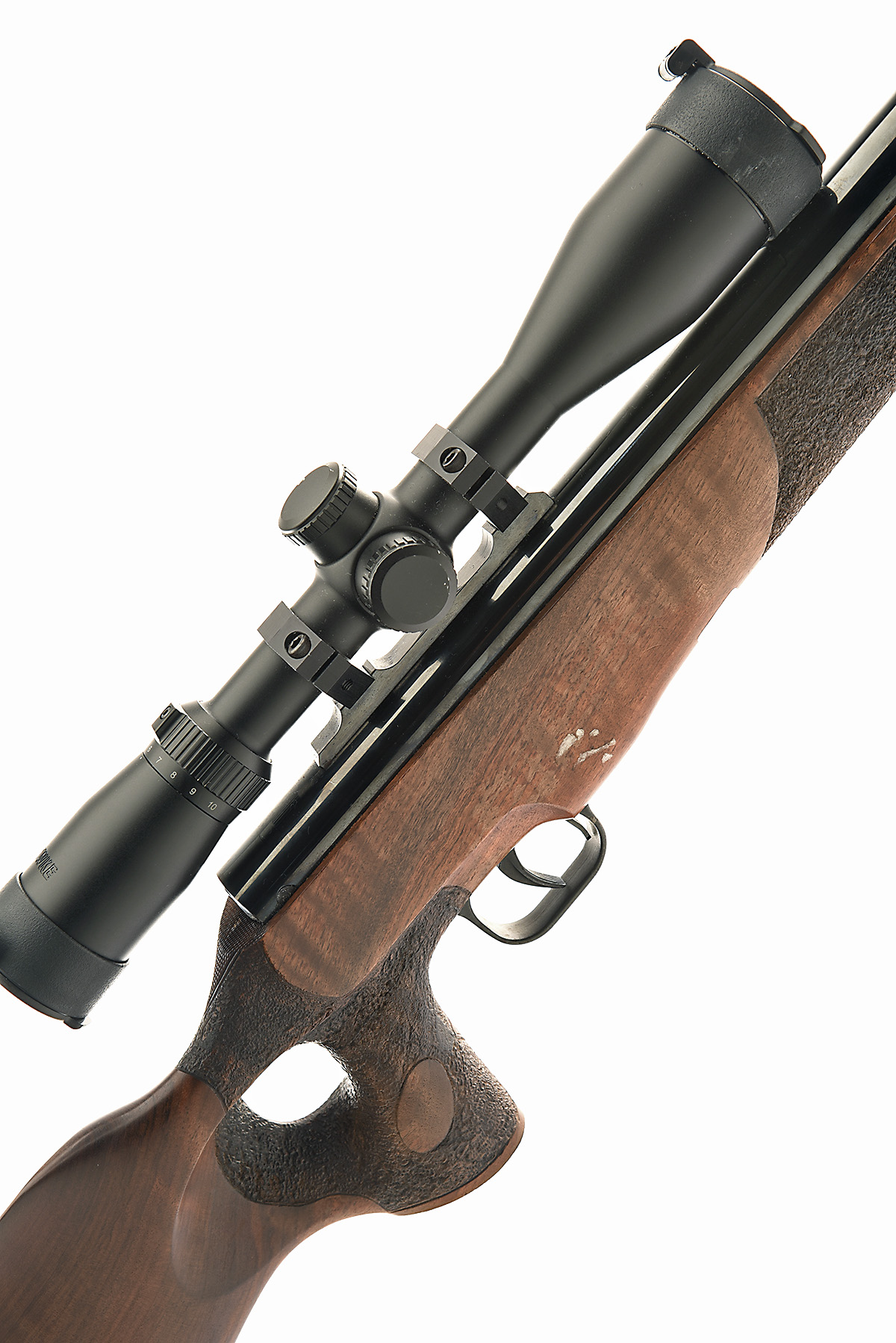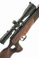AN FAC-RATED .22 THEOBEN ELIMINATOR BREAK-BARREL GAS-RAM AIR RIFLE WITH DON BLOCKSIDGE CUSTOM STOCK, serial no. TB5926, with blued 19 3/4in. barrel including built-on sound-moderator, blued air-chamber with dedicated telescopic sight rings, stippled figured walnut right hand thumbhole custom stock by Don Blocksidge and fitted with a Hawke 2.5-10 x 44 telescopic sight