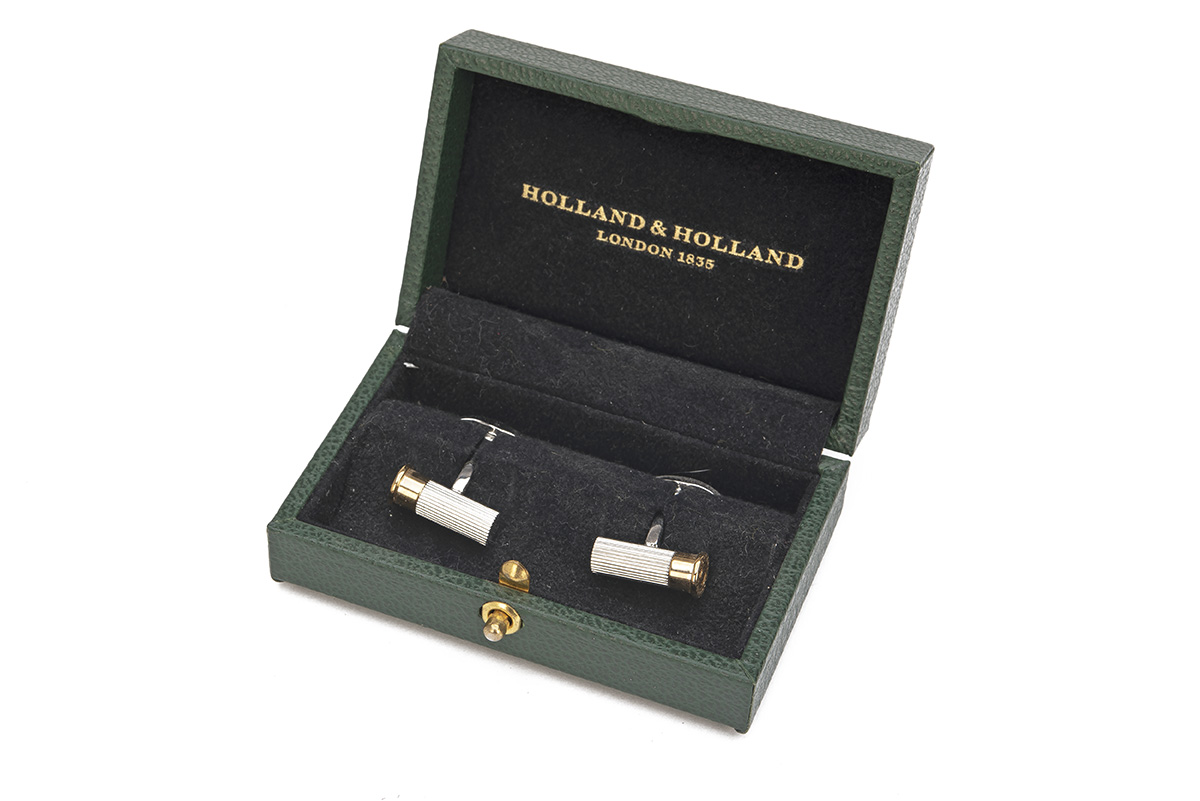 A SET OF RHODIUM CARTRIDGE CUFFLINKS, set in a Holland & Holland green velvet lined case