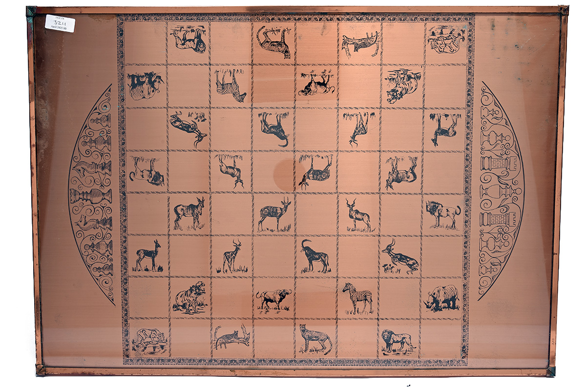 A LARGE BRONZE FRAMED AND GLAZED CHESS BOARD, with African antelopes squares, measuring approx. 33in. x 24in.