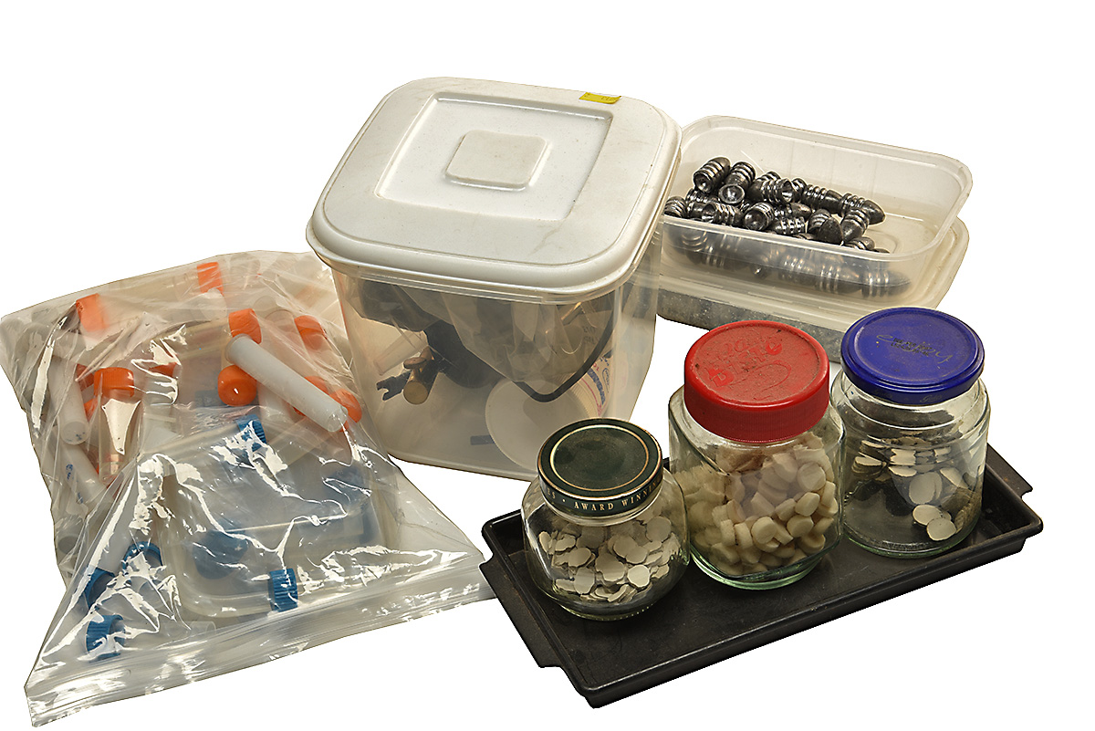 A QUANTITY OF RELOADING EQUIPMENT AND RELATED ITEMS, comprises of '9/16, 12mm, 10mm wad punches, 'OX-YOKE' wonder lube, various wads in jars, nipple wrench, multi-purpose nipple key, brass powder measure with funnel, brass powder measure, large quantity of storage tubes, approx. 50 .223 lead bullet heads among other related items