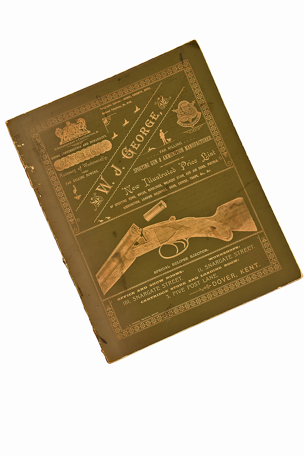 A RARE ORIGINAL LATE 19th CENTURY W. J. GEORGE OF DOVER ILLUSTRATED PRICE LIST, from 1897, 26pp heavily illustrated with B&W engraved pictures, green cover with gold printing, some edge-wear and staining to the cover, otherwise good and clean