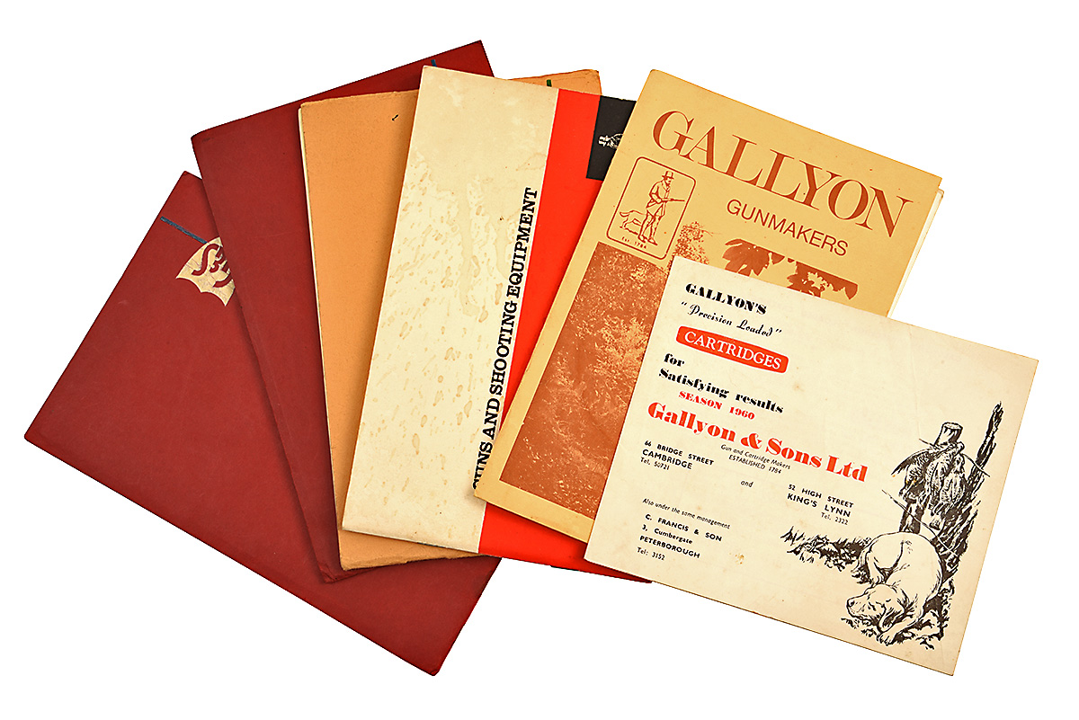 A GOOD GROUPING OF ORIGINAL GALLYON & SONS Ltd. GUNS & SHOOTING EQUIPMENT CATALOGUES, all heavily illustrated with B&W drawings and photos, being 1) catalogue of 32pp plus a price list for1948; 2) catalogue of 32pp plus a price list for 1951-52 and price list for cartridges for season 1950-51 together with a covering headed letter dated 1951 advising these are being sent following a customer's request; 3) a circa 1960 catalogue of 44pp; 4) a 6-page folding catalogue and price list for Gallyons Cartridges from 1960 with colour pictures; 5) a 1970s catalogue of 60pp; 6) a 1970s card folder containing individual brochures on clothing and footwear, gun and shooting accessories, selecting a gun, single barrel shotguns, new hand-made guns, and new imported guns