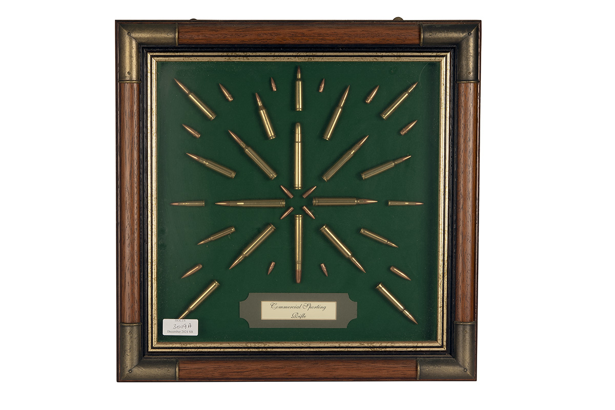 A 'COMMERCIAL SPORTING RIFLE' CARTRIDGE DISPLAY BOARD, show a starburst of inert metallic cartridges and bullet heads, mounted on green baize, set in a glazed framed wooden frame with brass corners