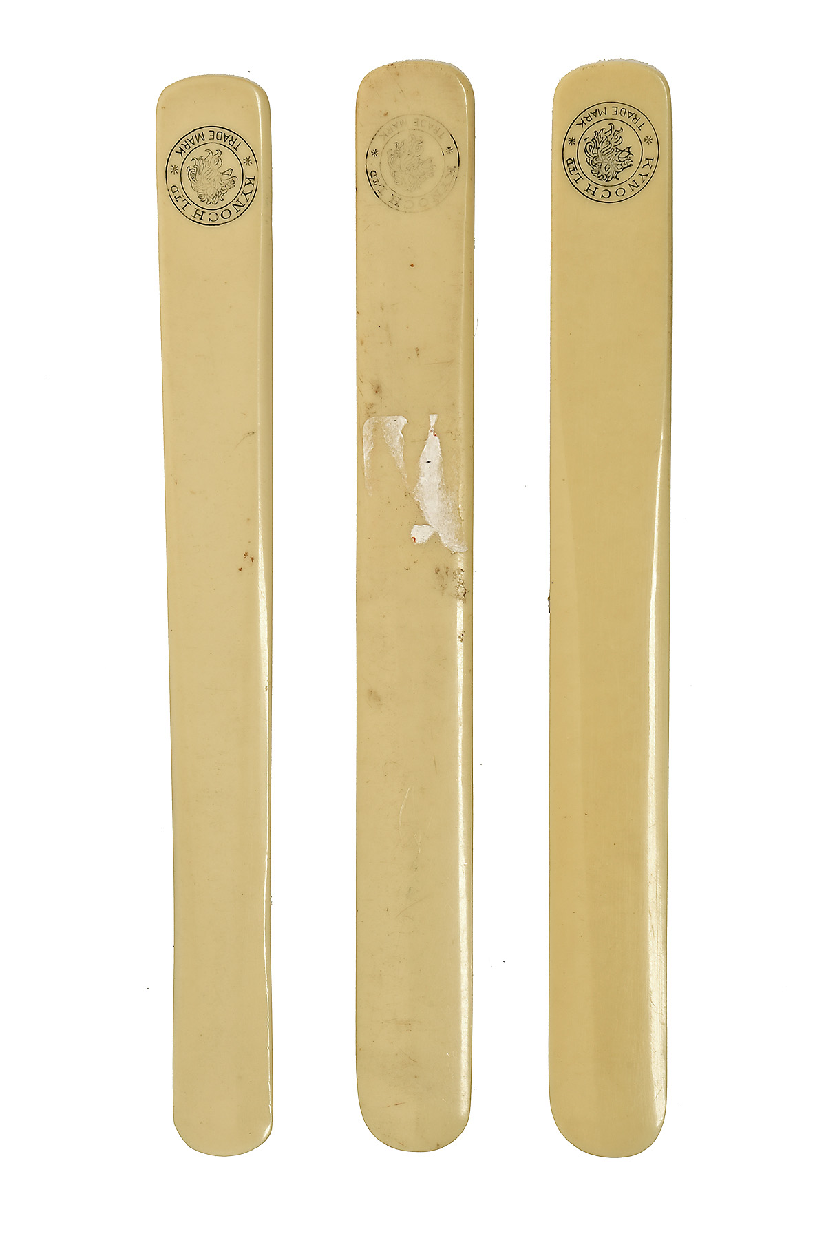 THREE 'KYNOCH LTD' IVORINE LETTER OPENERS, with lion head roundel (3)