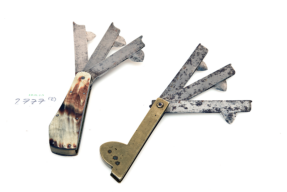 TWO ANTIQUE 'BORWICK CAST STEEL' VETERINARY FLEAMS, 1 x cow horn scale, brass liner, 3 blade fleam, 1 x brass body, 3 blade fleam, (2)